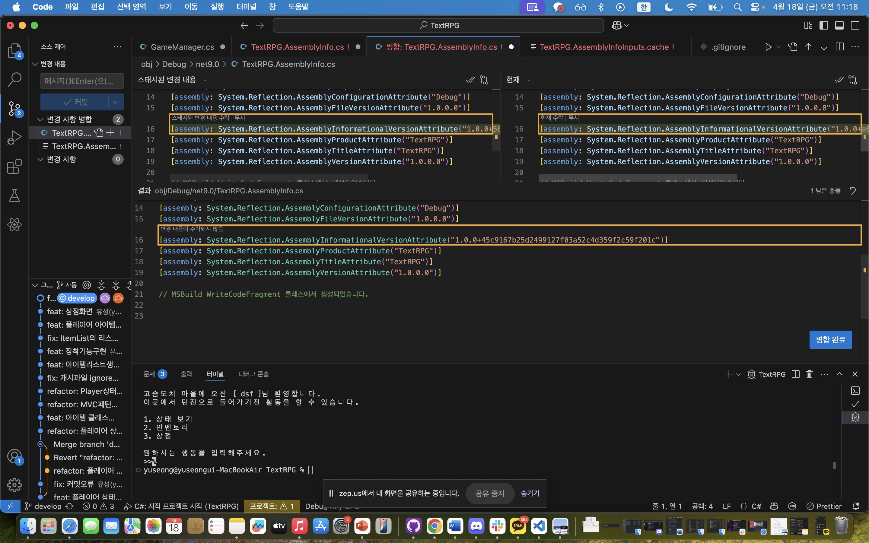 해결을 위해 Git Graph와 GitLens를 설치하고,