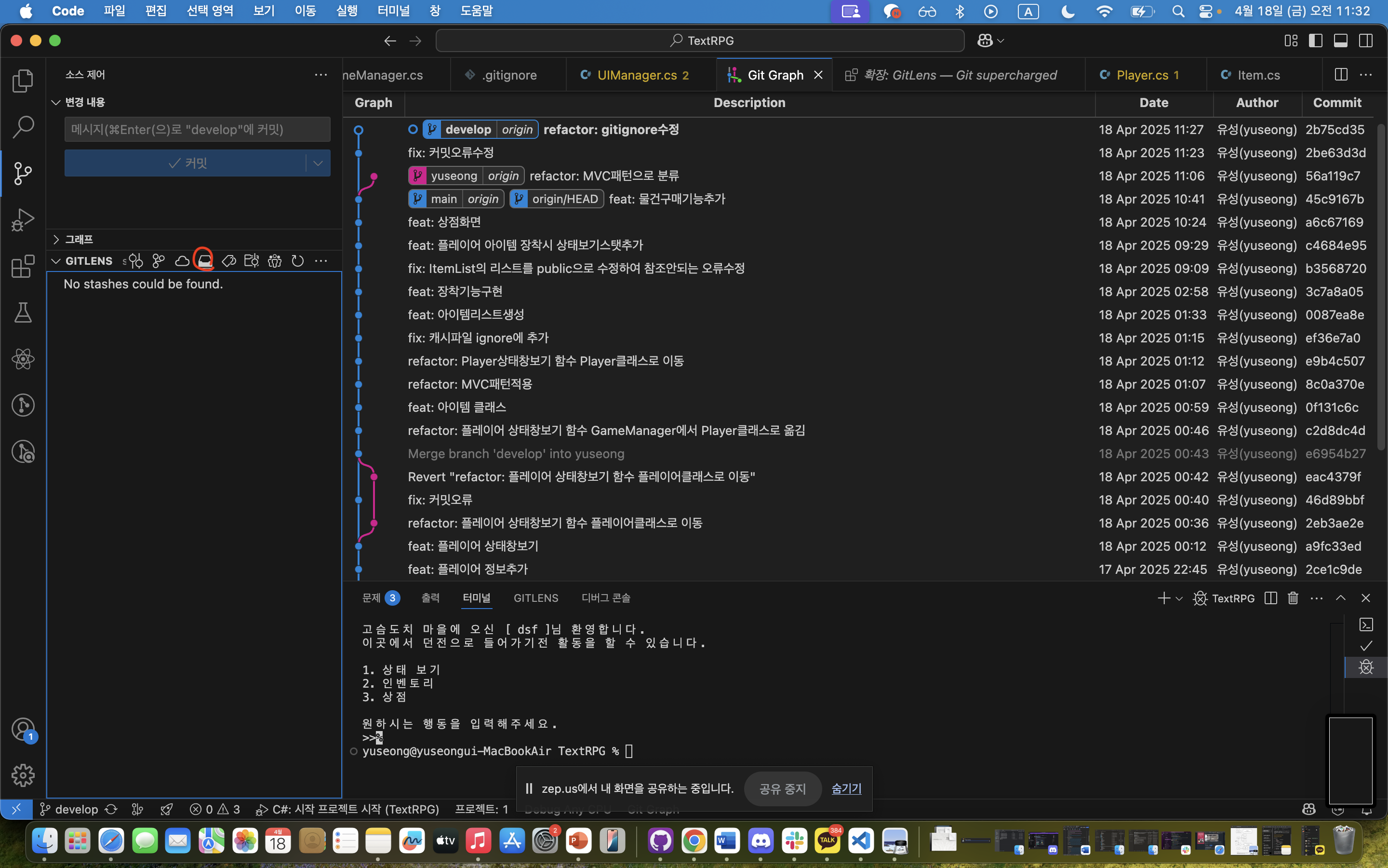 그리고 오류를 해결하려다 보니 나도 모르게 stashes(스태시)도 만들어버렸다.