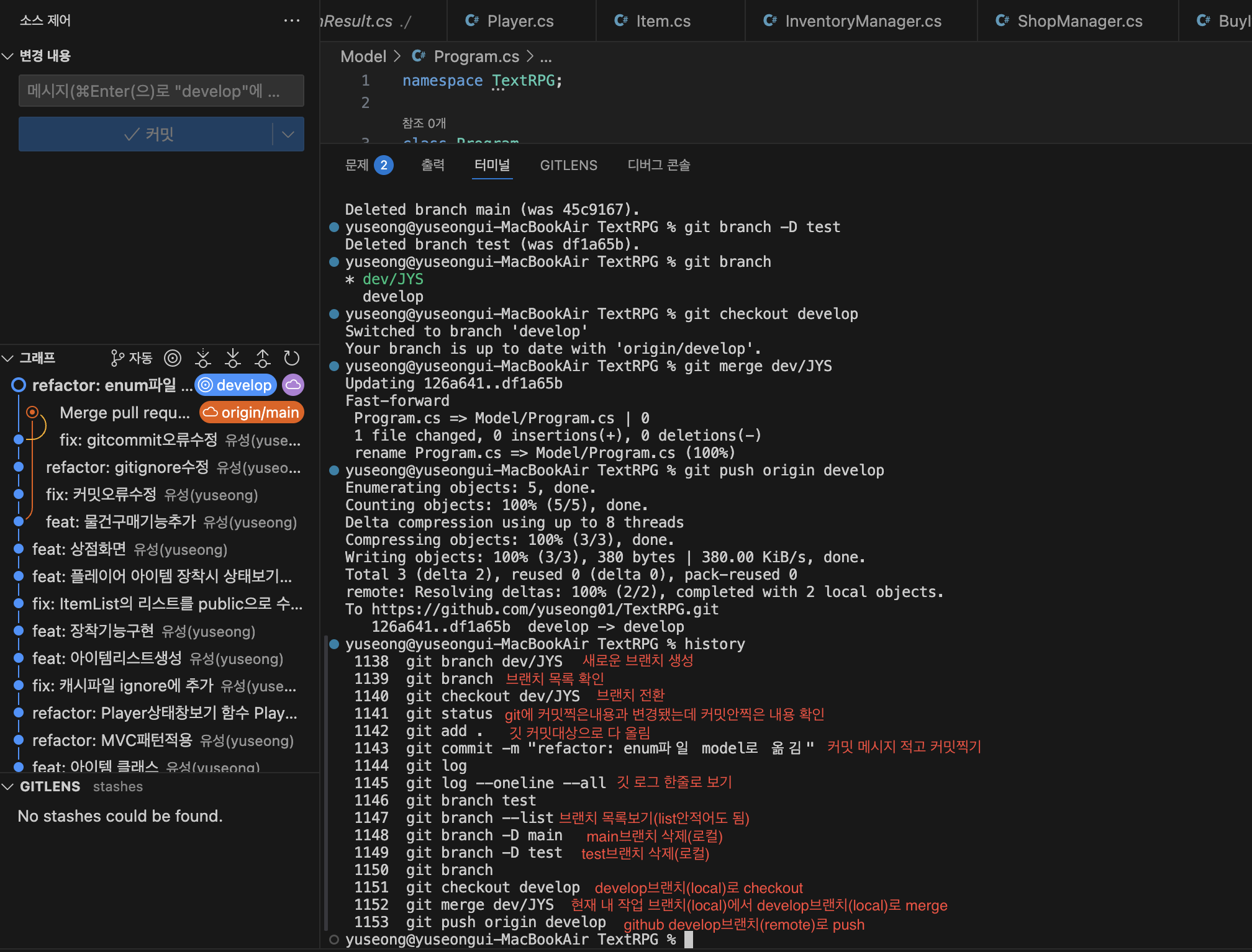 내 작업이 끝나면 develop브랜치에 merge를 하고 최종적으로 GitHub에 올리는 push를 해야한다.
