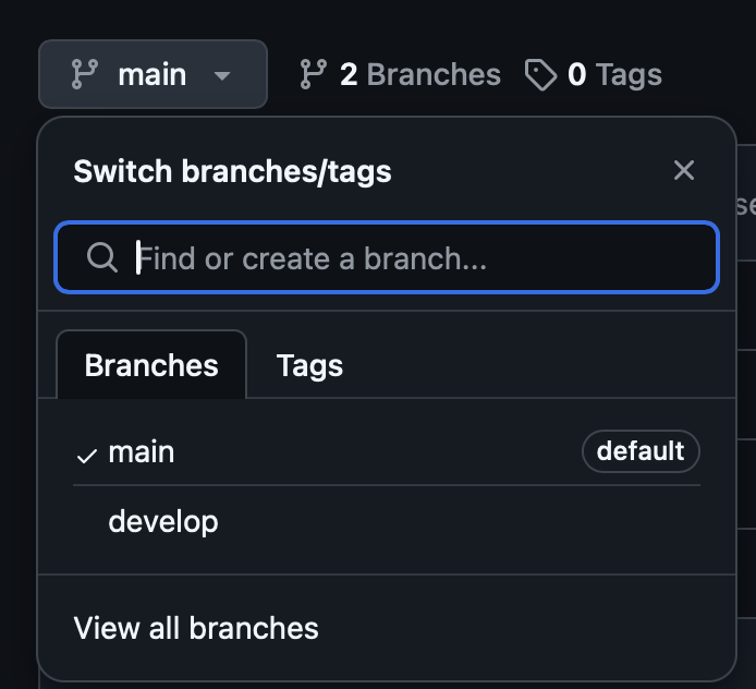 나는 이 main에서 develop브랜치를 만들었다. 그러면 이제 remote브랜치에는 아래 사진처럼 main,develop브랜치가 있다.
