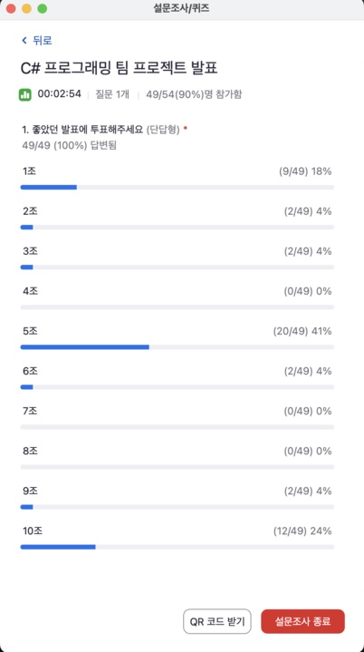 🔥 우리 5조는 결과적으로 49표중 20표로 41%의 득표율을 보여주면서 1등이라는 성과까지 얻게 되어 더욱 뜻깊은 경험이었다.