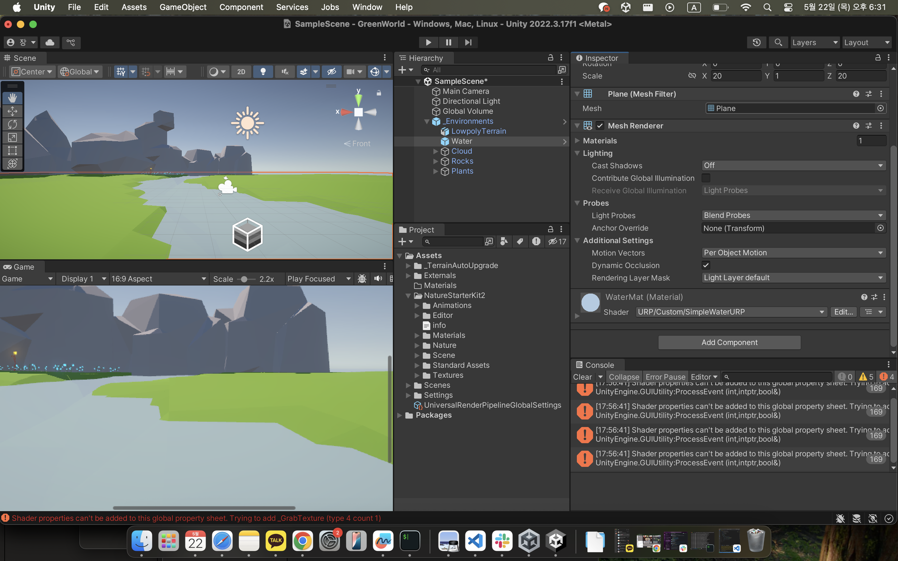 Water의 Inspector창에서 Shader경로를 위와 동일하게 바꿔준다.