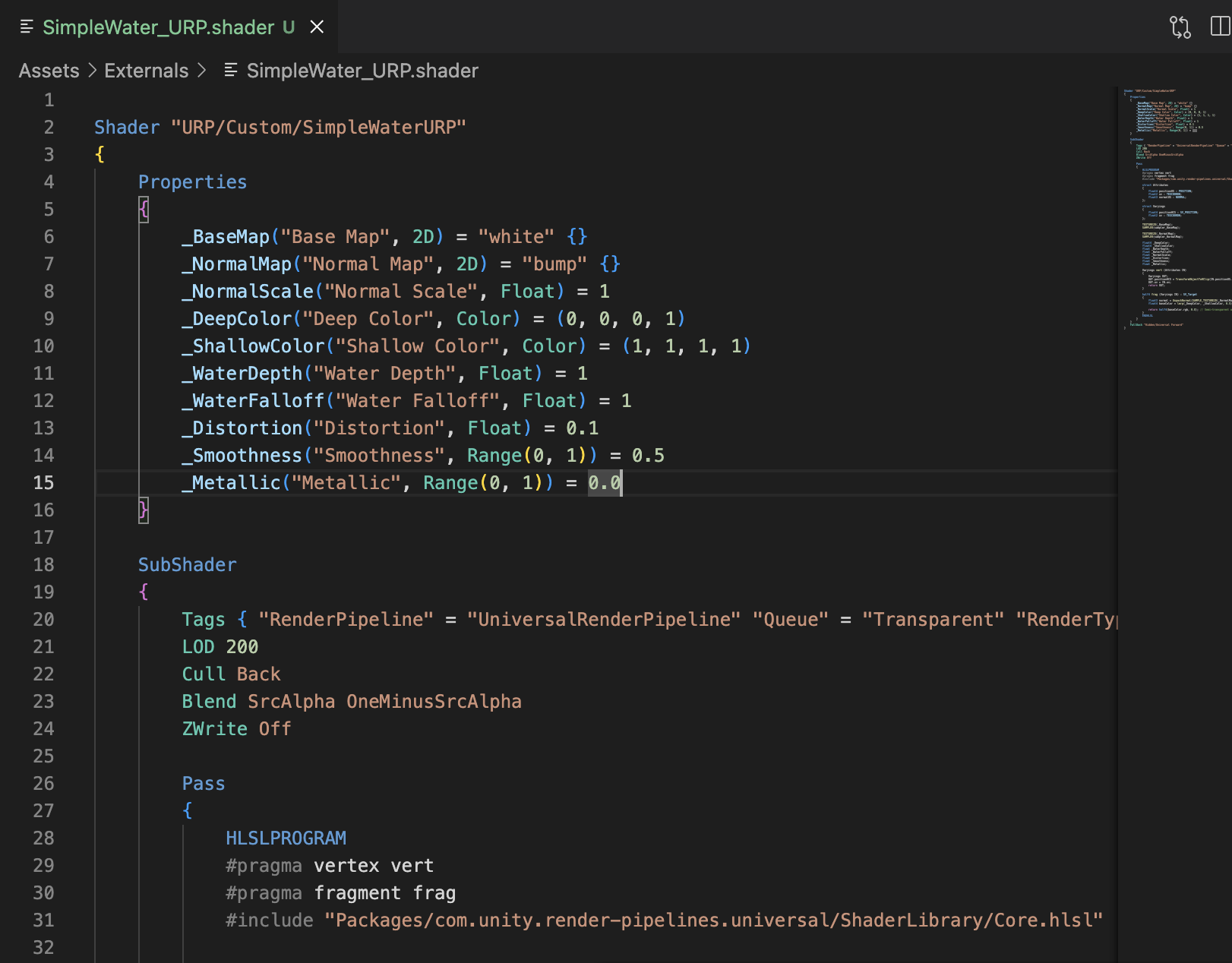 Water의 Inspector창에 들어가서 Shader 부분에 Edit을 눌러 코드로 들어가준다.