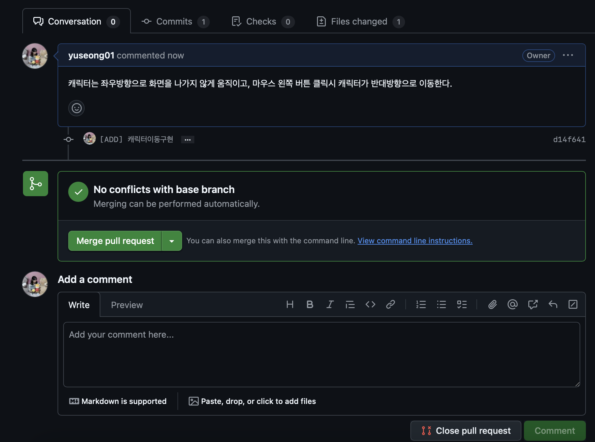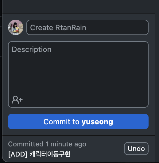 (9) 버튼을 눌러보면 이렇게 main브랜치에 yuseong브랜치 작업물을 합친다는 main<-yuseong이 있고, 아까 적었던 커밋 내용이 있다.