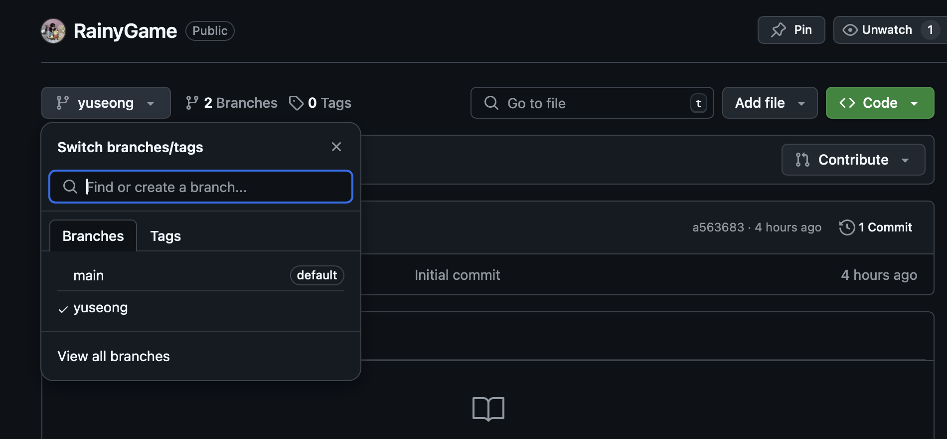 (6) 깃허브에 가보면 아까 만들었던 yuseong 브랜치가 있다