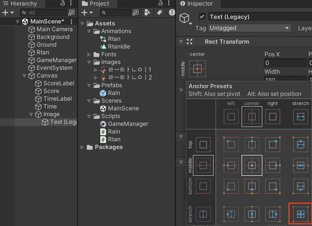 그러기 위해서, Rect Transform에 있는 네모난 상자를 누르고,