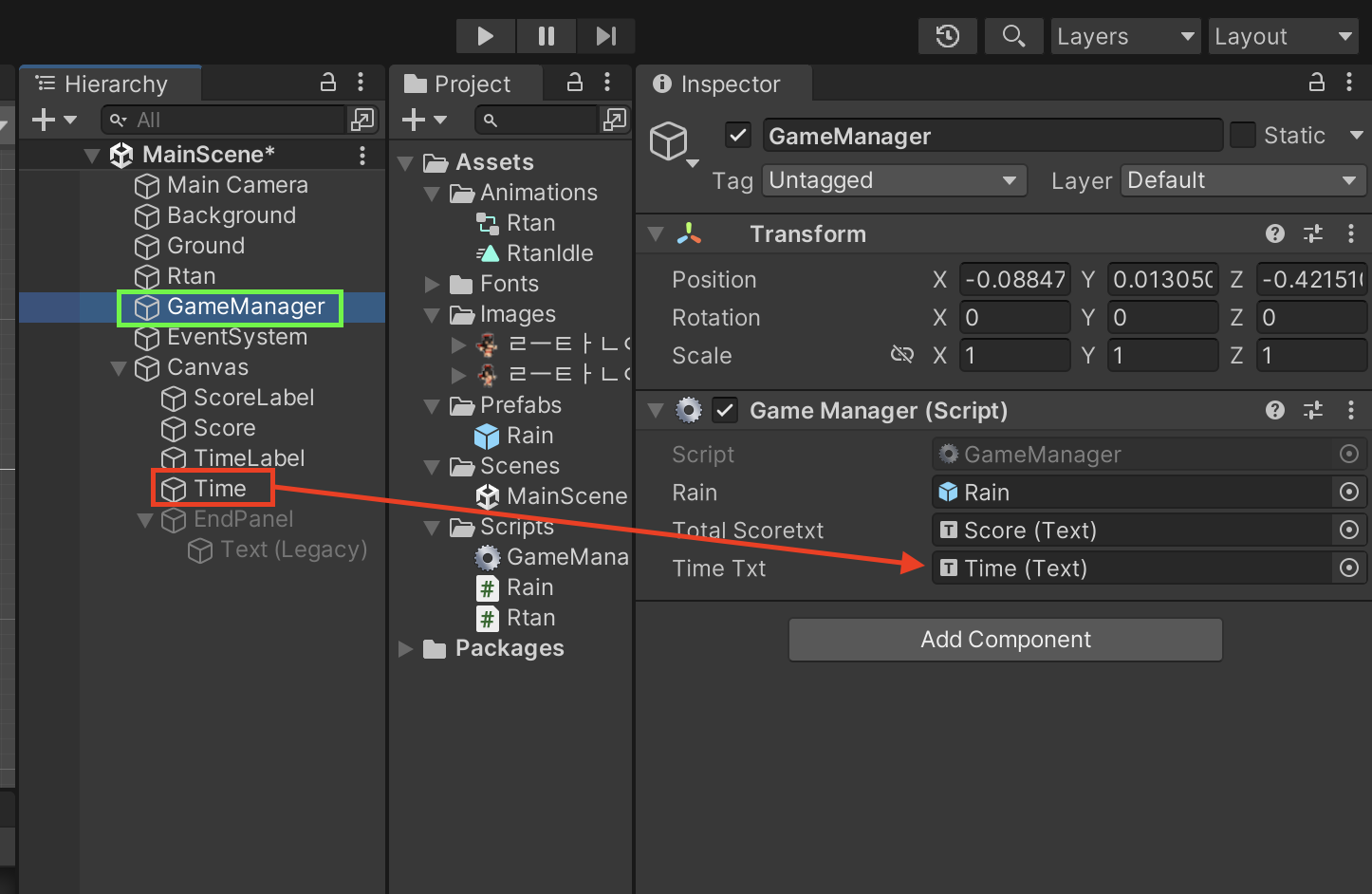 Unity로 돌아와서 GameManager클릭 후 Time Txt에 Time을 드래그 앤 드롭으로 넣어준다.