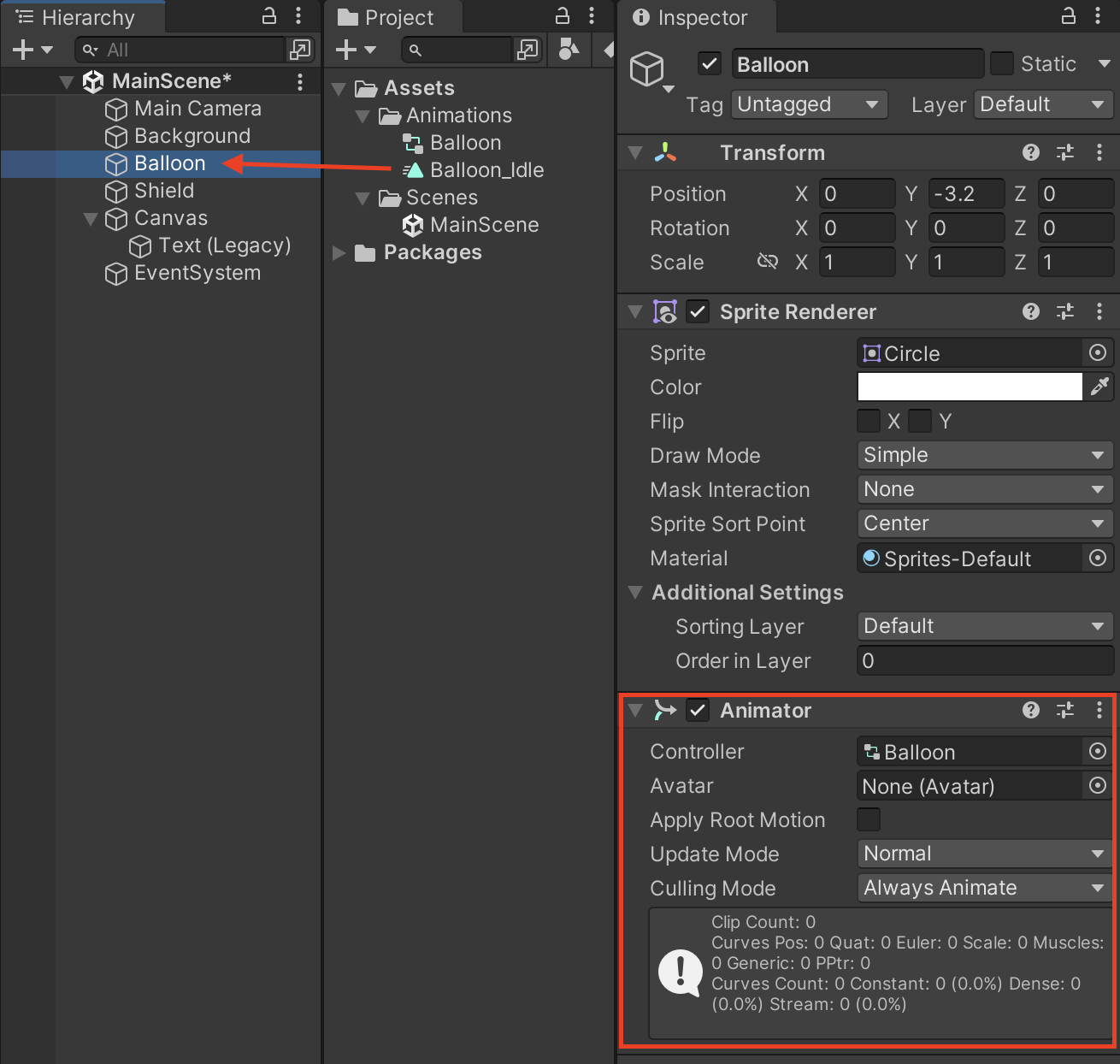 그리고 Balloon_Idle를 Balloon에 드래그 하면 Balloon에 Animatior가 생성된다.