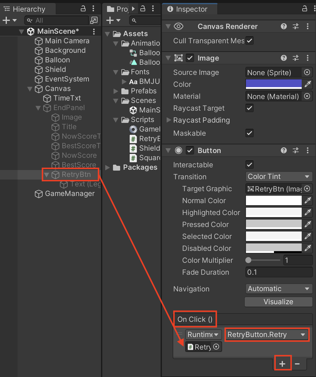 Hierarchy의 RetryBtn의 OnClick의 +버튼을 누른 후 RetryBtn을 추가하고,