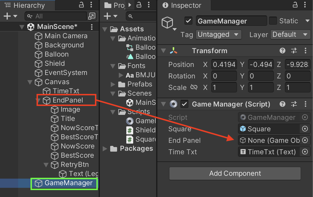 GameManger의 EndPanel에 EndPanel드래그 앤 드롭해준다.