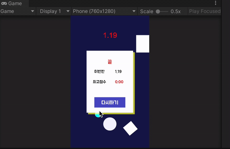 게임이 종료됐을 때 현재 게임 오버시 멈춘 시간을 현재 점수로 보여주어야 한다.
