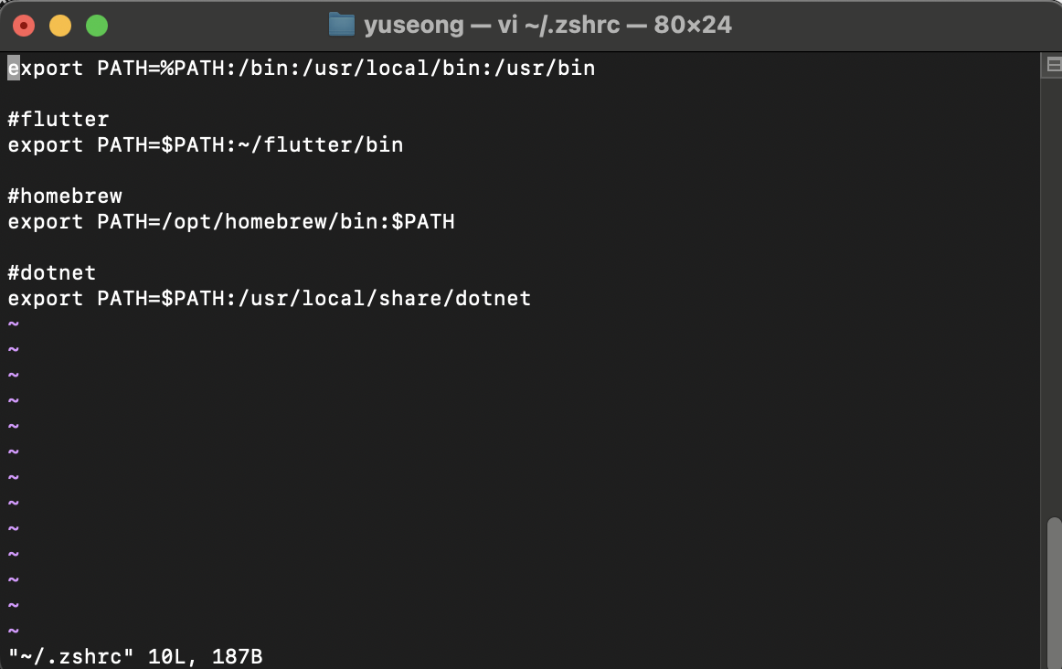 원래는 SDK설치시에 자동으로 ./zshrc에 dotnet 경로가 추가되는데 안되서 수동으로 아래의 경로를 추가해주었다.