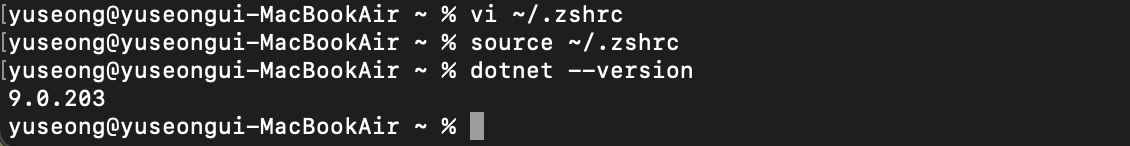 - zshrc에 경로를 추가한 후 터미널에 dotnet --version이라고 치면 버전이 나온다.