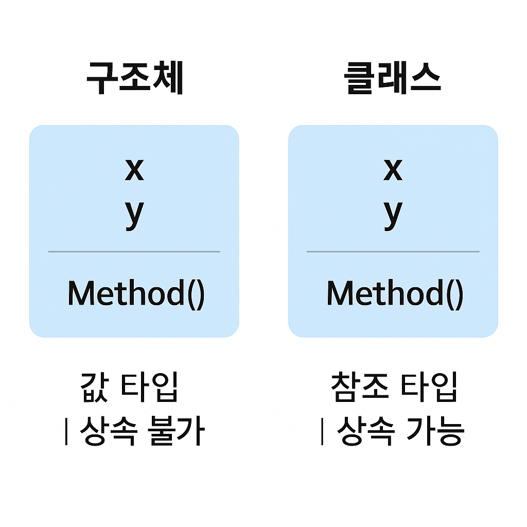 1. 기본 개념C#을 공부하다 보면 class와 struct의 차이에 대해 혼란스러울 수 있다.둘 다 데이터를 담는 틀이라는 점은 같지만 동작 방식과 사용 목적이 다르다.이 글에서는 클래스와 구조체의 차이를 정리하고 언제 어떤 걸 사용하면 좋은지, 그리고 구조체의 한계점까지 알아보자. 🔹시작전 각각의 개념을 한번 더 복습해보자. ✅ 클래스란?참조형(reference type)new 키워드로 인스턴스를 생성힙(Heap) 메모리에 저장됨변수에 객체의 참조(주소) 를 저장상속, 다형성 등 객체 지향 프로그래밍(OOP) 특징을 활용할 수 있음class Person { public string Name; public int Age;} ✅ 구조체란?값형(value type)new 없이도 사용 가능..