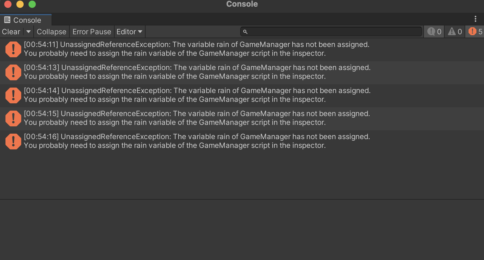 Rain오브젝트를 Prefab으로 만든 후 GameManager에 넣고 디버깅을 했는데 아래와 같이 UnassignedReferenceException오류가 나면서 빗방울이 생성되지않았다. 찾아보니 이 오류는 참조타입 데이터가 초기화 되지않아 Null인 값을 호출하여 연산,메소드를 실행하려고 했을때 발생하는 오류라고 한다.그리고 오류메시지에 보면 assign the rain variable of the GameManager script in the inspector라고 적혀있다. GameManager에 rain할당문제가 있는지 확인해봤더니 아까 할당했던 Rain이 None으로 되어있었다. 그래서 다시 Assets>Prefabs에 있는 Rain을 Game Manager의 Rain에 드래그 앤 드롭해주었다..